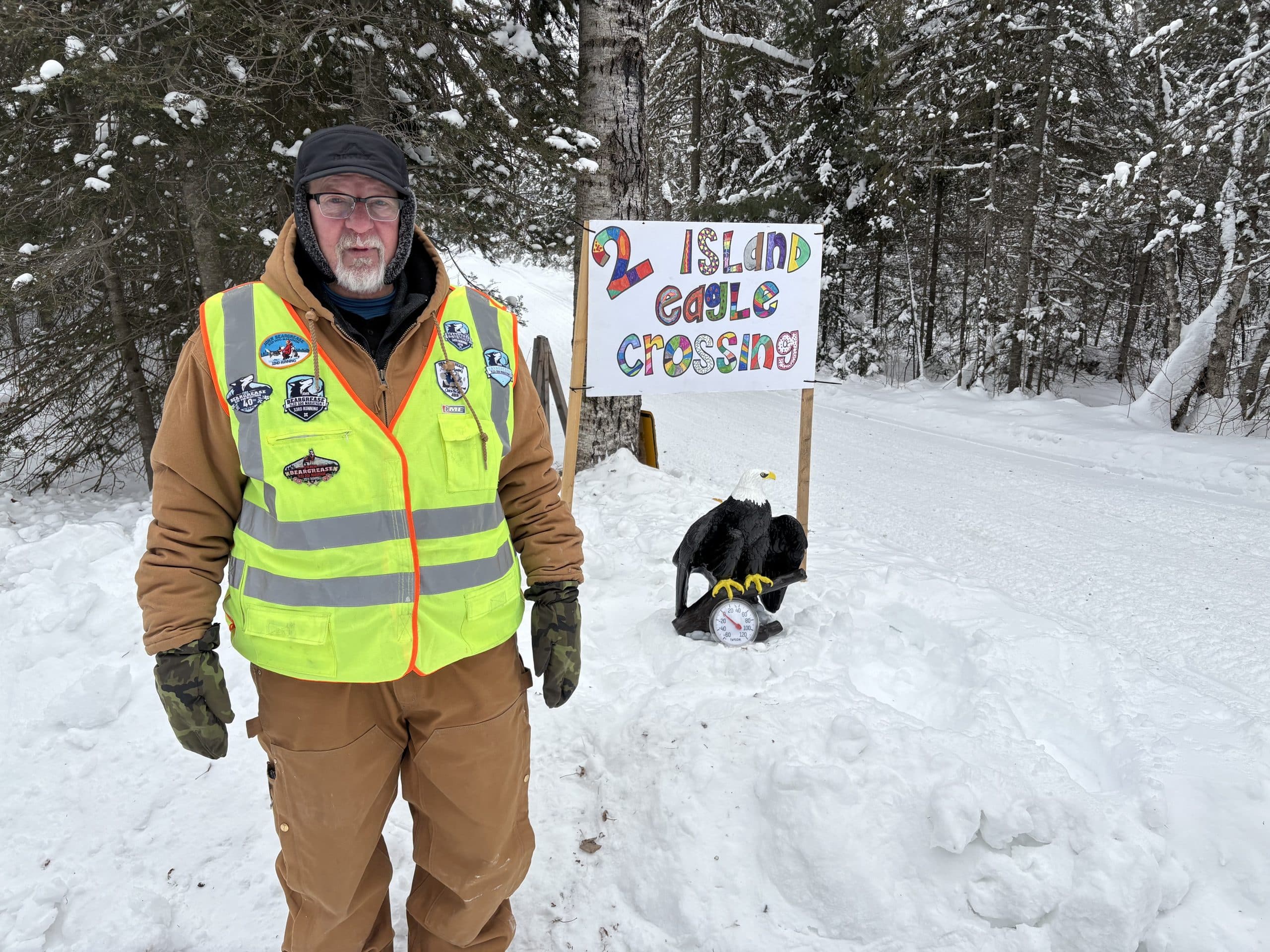 Darrell brings his own charm to the remote crossing, an eagle statue now adorning the section of forest near the clearing where the mushers enter the forest after crossing the road. There’s a thermometer under the eagle, and it read minus 4 degrees Jan. 26, Darrell’s busiest day during this year’s Beargrease. A small fire burning nearby helps out, as does Darrell’s FM radio, set to an oldies station. “Leaving on a Jet Plane” comes over the airwaves just another musher comes down the hill from the Two Island Campground to the crossing.