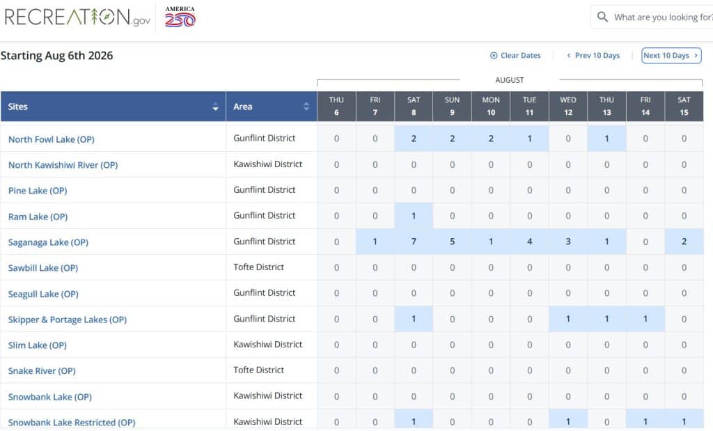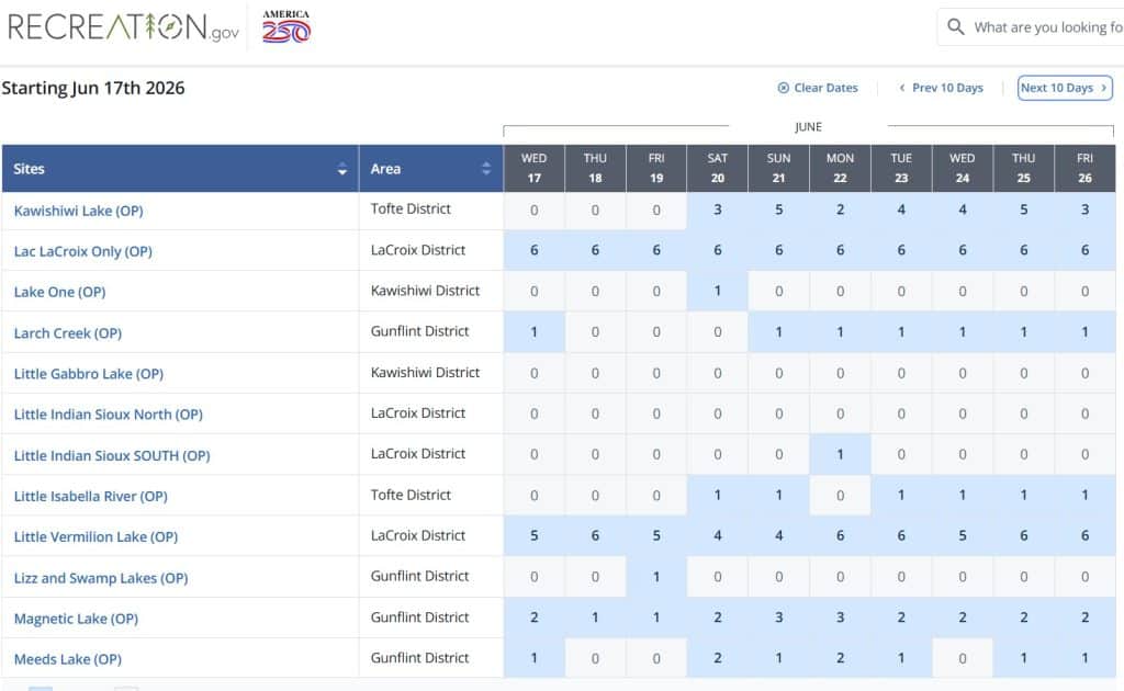 For Little Indian Sioux North there are four overnight paddle permits available during the quota season. On Sunday, May 10 there are two of the four permits available. May 11 has three of the four permits available. Following that, there isn’t a single permit available for this entry point until the final days of September.
